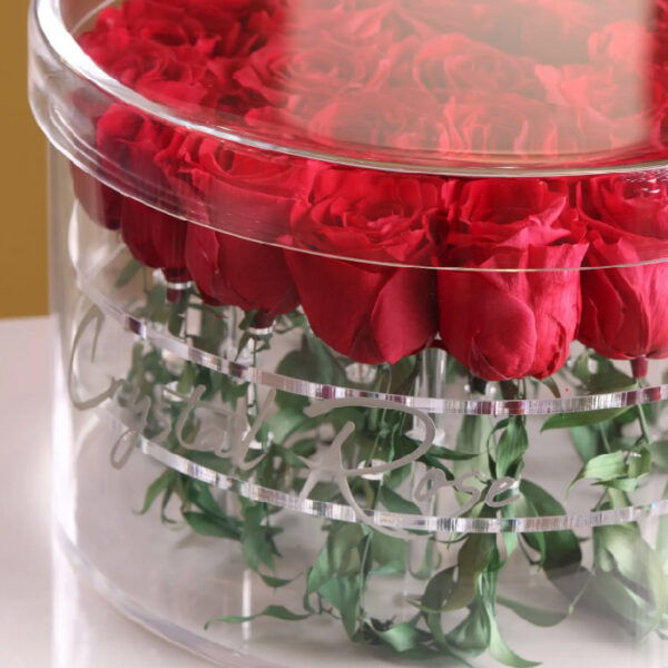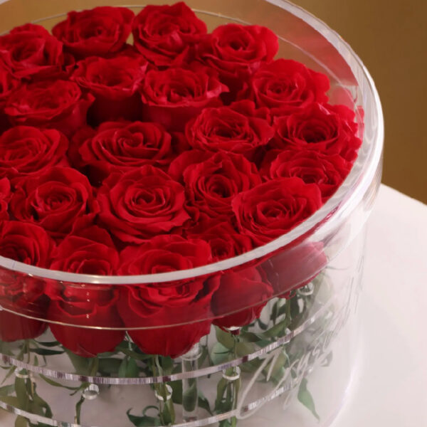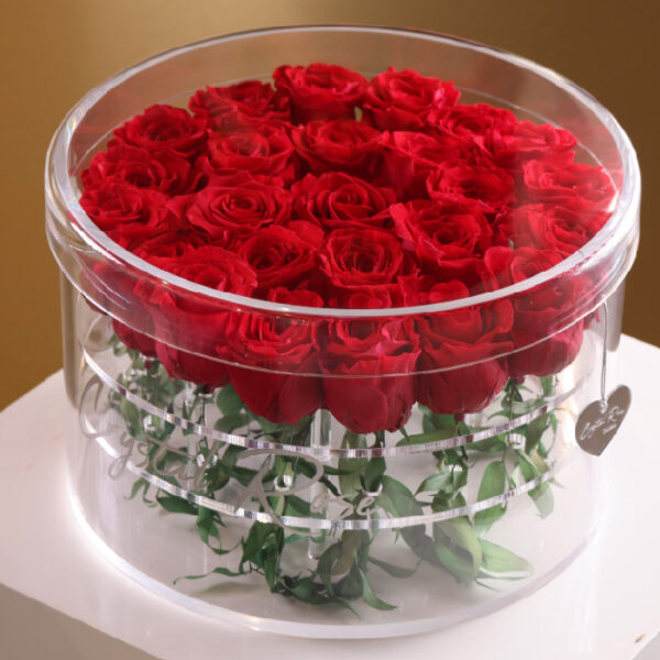 Make someone’s day brighter with 25 long-lasting roses in a 30 cm clear acrylic circular box.
