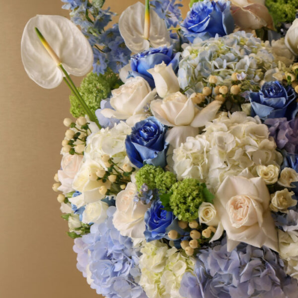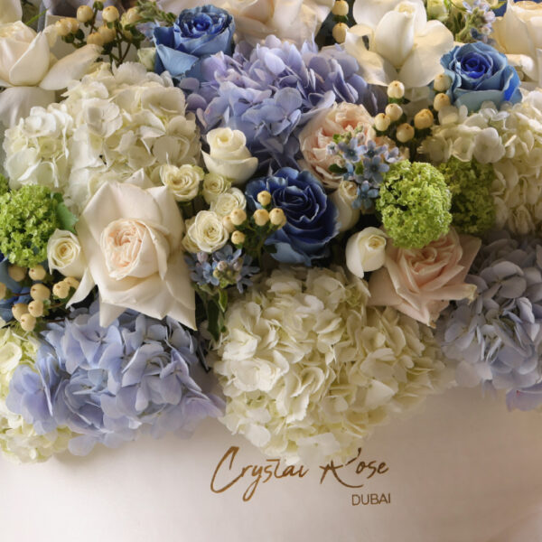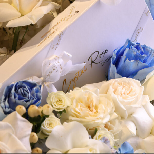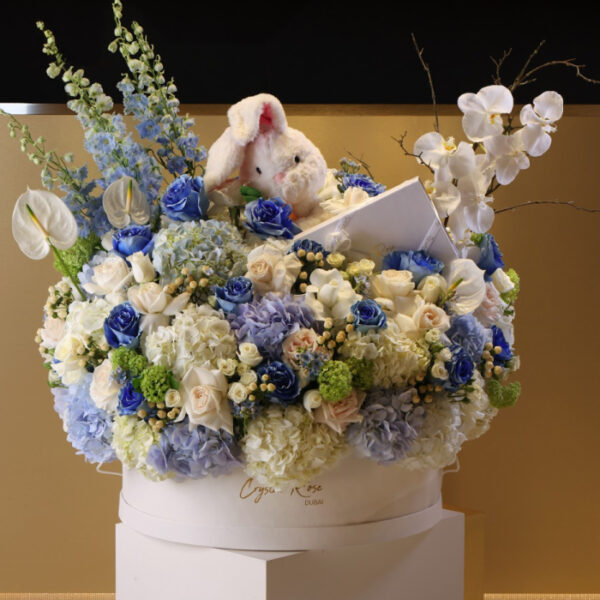 A flower arrangement in a box with stuffed toys is a delightful and charming gift idea. The flowers are usually arranged in a stylish, compact box accompanied by one or more plush toys to add a playful and sweet touch